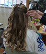 - 中間部から毛先にブルーに色付けしたみの毛を、ヘアアイロンでカールを付け、 地毛に挟み込みながらヘア用のボンドで取り付けました。